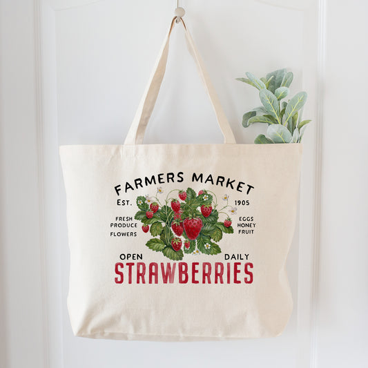 Strawberry Bag - Grocery, Reusable, Eco, Canvas Tote Bag with Zipper, Large, Fabric Shoulder Bag
