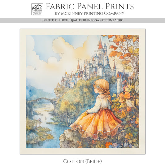 Fairy Tale Painting - Fantasy Fabric, Castle, Cotton, Girl, Floral, Baby Fabric Panels, Nursery Décor, Quilt Block, Quilting