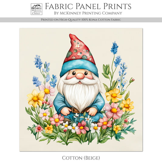 Gnome Fabric - Farmhouse, Floral, Spring, Summer, Baby Fabric Panels, Nursery Décor, Quilt Block, Cotton, Quilting