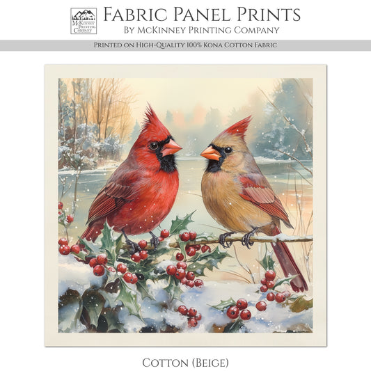 Cardinal Fabric - Bird Fabric Panel, Woodland Animal, Christmas Fabric Panels, Watercolor, Large Print, Block Print, Cotton, Quilting, Quilt