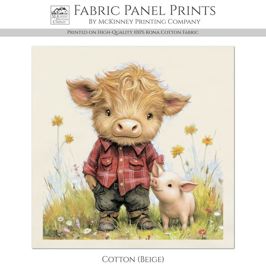 Highland Cow - Baby Fabric Panels, Pig, Farm, Boy, Blanket, Nursery Décor, Quilt Block, Cotton, Quilting