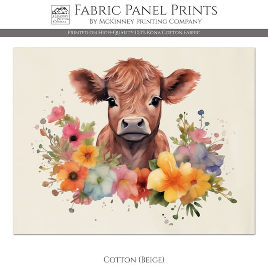 Highland Cow Print - Fabric Panel, Calf, Floral, Farm, Nursery Décor, Quilt Block, Wall Art, Baby Fabric Panels
