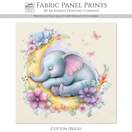 Elephant Fabric - Baby Fabric Panels, Moon, Floral, Canvas, Shower Gift, Nursery Décor, Quilt Block, Cotton, Quilting