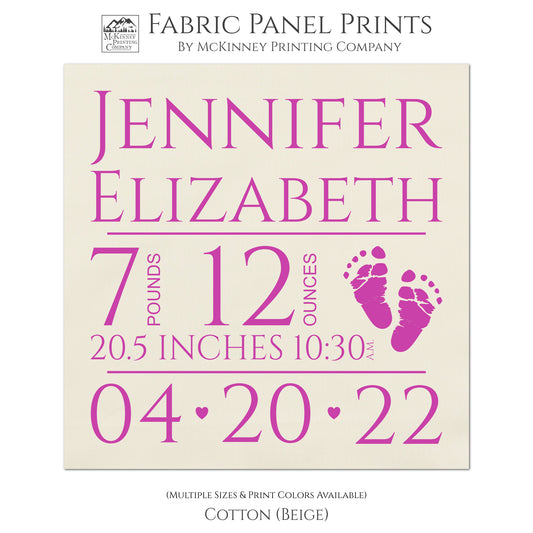 Baby Fabric Panel - Custom, Birth Stats, Quilting Block, Infant, Boy, Girl, Weight, Time, Date, Wall Art