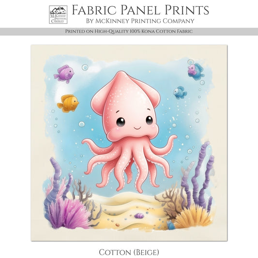 Squid - Ocean Animal Fabric, Baby Fabric Panels, Sea Creatures, Boy, Nursery Décor, Quilt Block, Cotton, Quilting