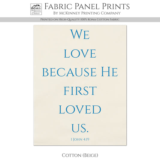 1 John 4:19 - Scripture Fabric, We Love Because He First Loved Us, Christian, Large | Small Cotton Quilt Block