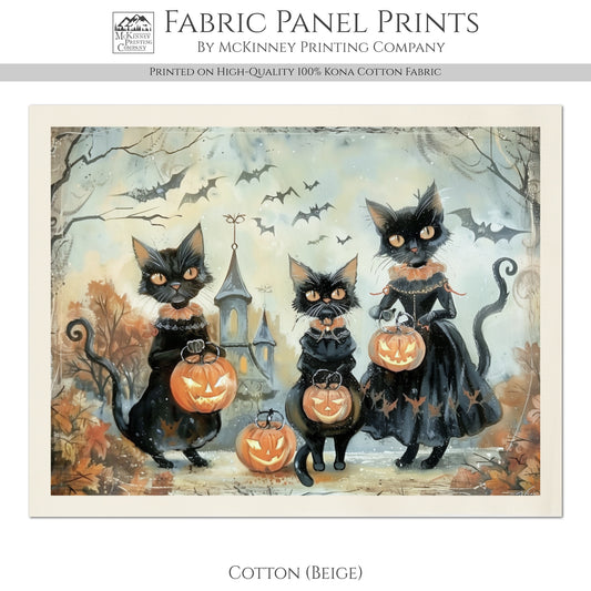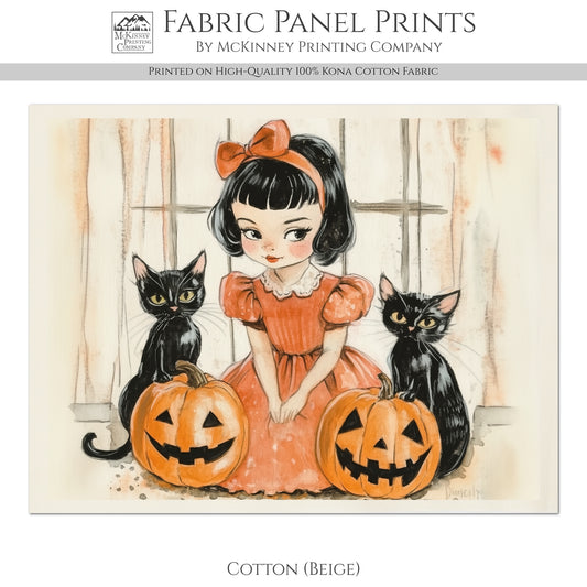 Halloween Fabric Panel - Black Cat Fabric, Vintage, Retro, Girl, Craft, Pumpkin, Large Print, Block Print, Cotton, Quilting, Quilt, Canvas