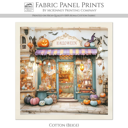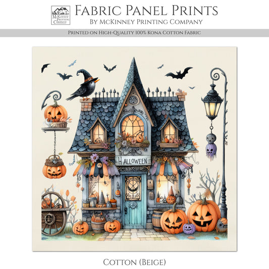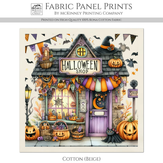 Halloween Fabric - Fall Fabric Panel, Old Downtown Store, Pumpkin, Decor, Bat, Watercolor, Cotton, Quilt Block, Wall Art
