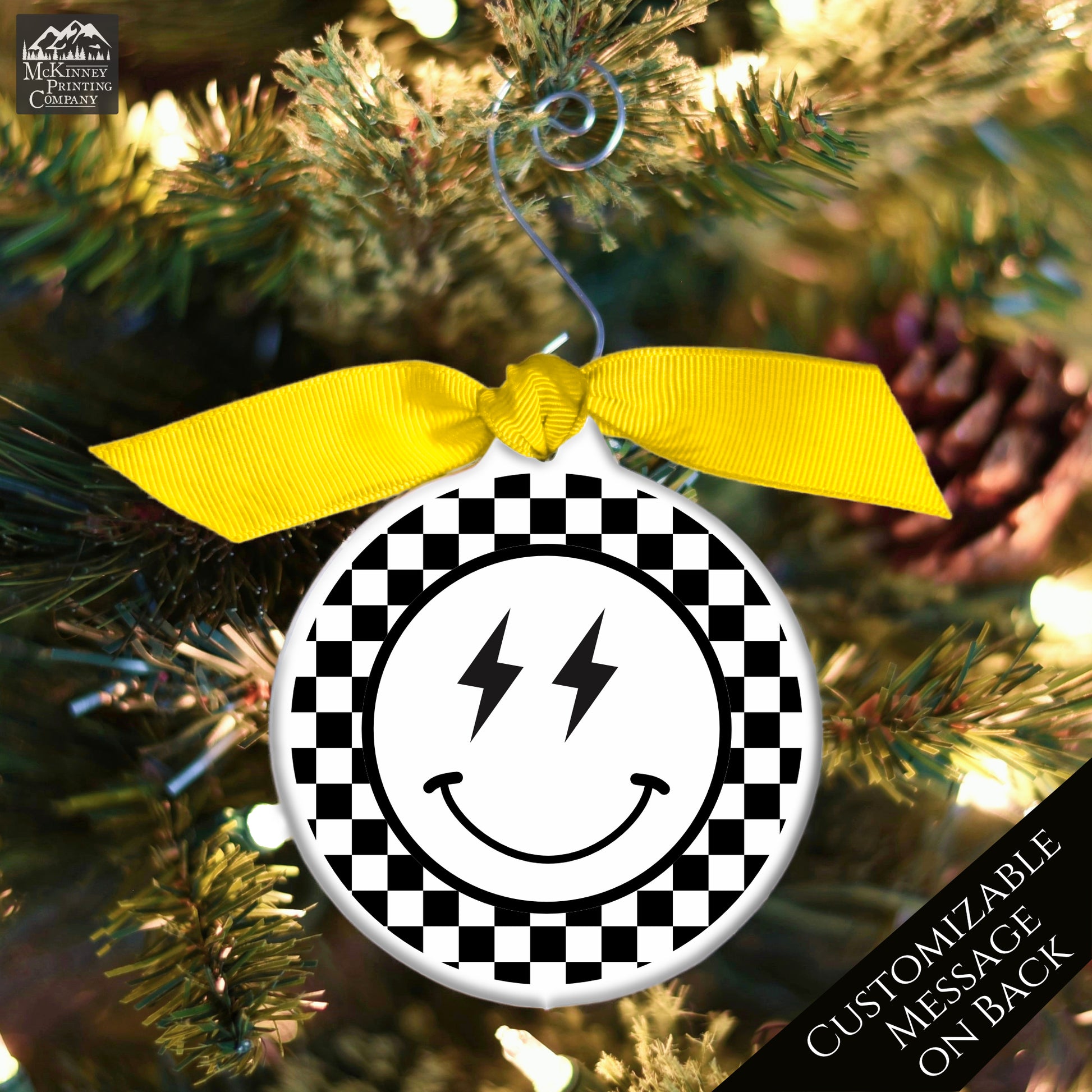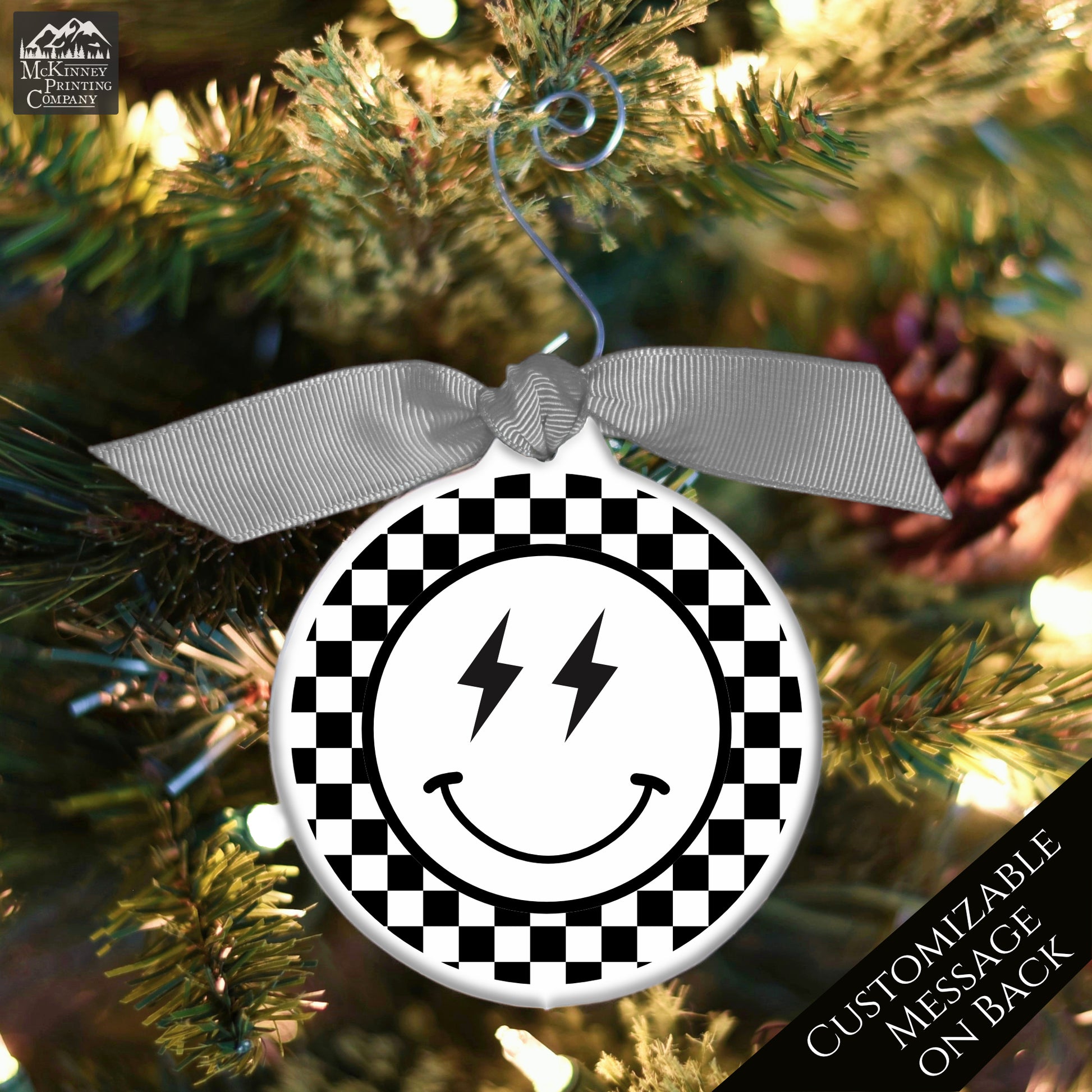 Emoji Christmas - Ornament, Smiley Face, Lightning, Black and White Check