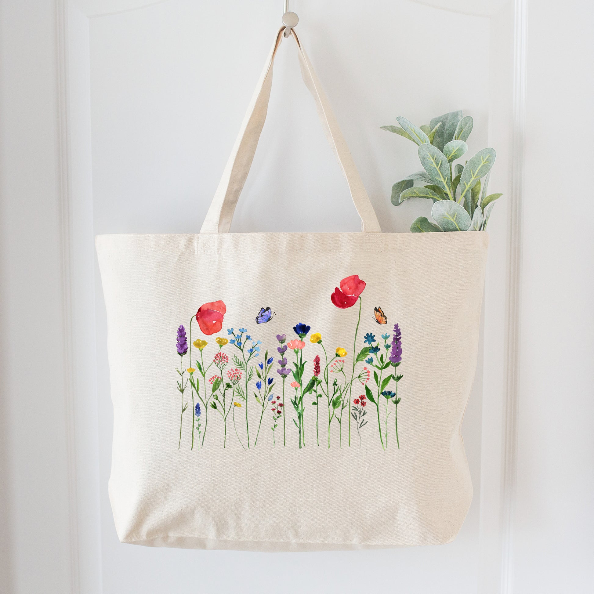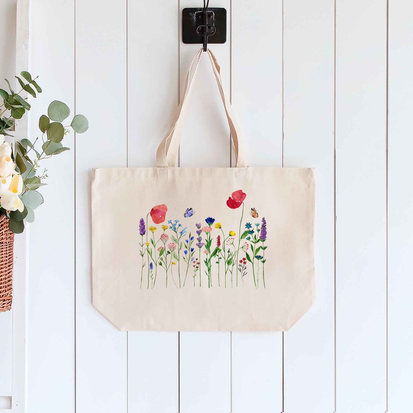 Floral Tote Bag - Flower, Wildflower, Canvas Tote Bag with Zipper, Large, Fabric Shoulder Bag
