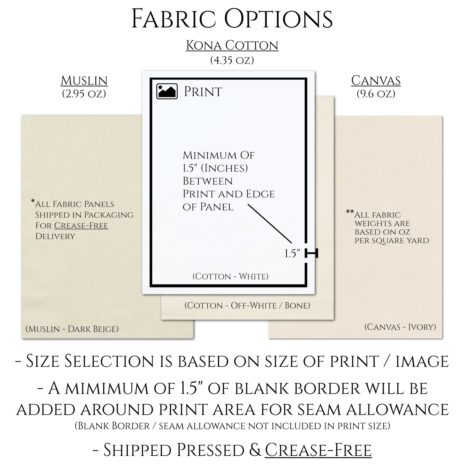 Printed on 4.35 oz 100% Kona Cotton by Robert Kaufman or Natural Muslin