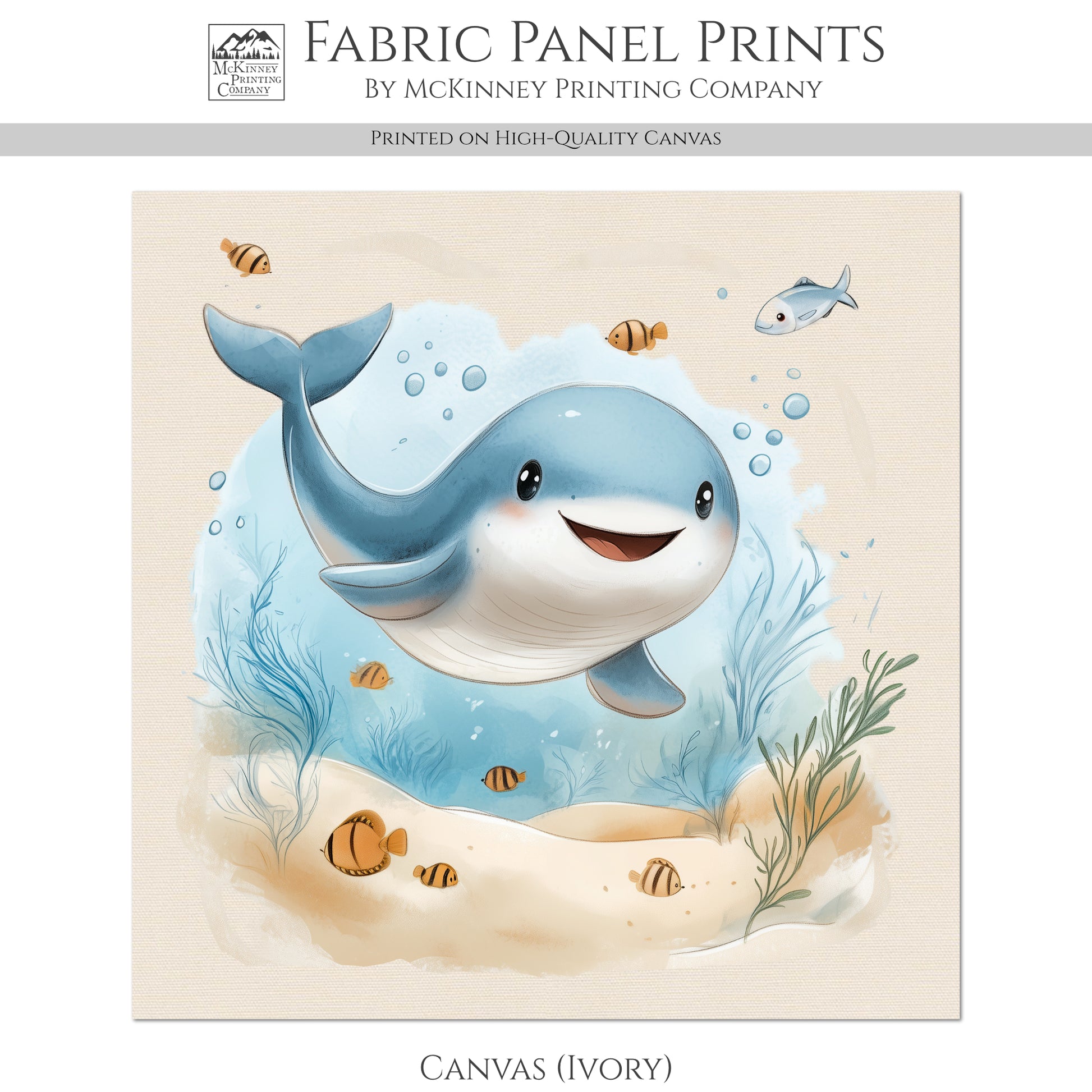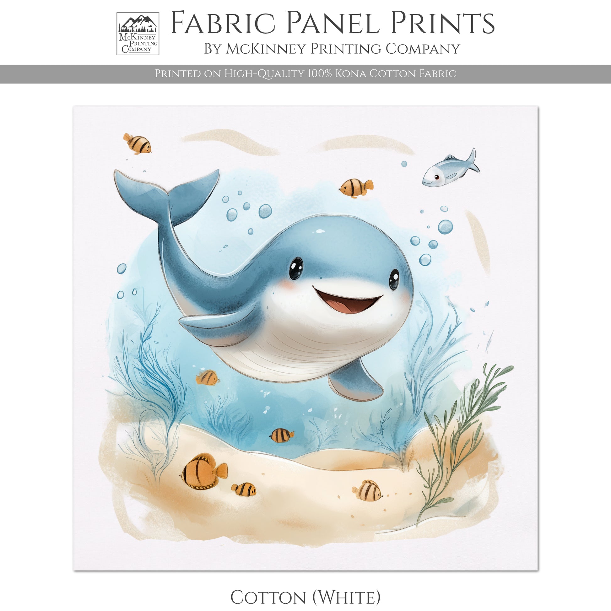Whale Fabric - Baby Fabric Panels, Sea, Ocean, Boy, Blanket, Nursery Décor, Quilt Block, Cotton, Quilting